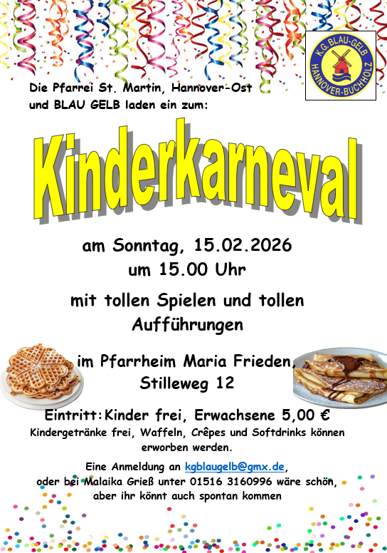 Auch dieses Jahr lädt BLAU GELB zusammen mit der Pfarrei St. Martin, Hannover Ost zum Kinderkarneval im Pfarrheim Maria Frieden ein. Neben vielen Spielen und einigen Tänzen unserer Kindergarden ist auch wieder Clown Luftikus dabei. Der Eintritt beträgt nur 2,50 EUR für essen und Getränke.